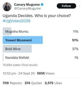 with all this happening, online polls have been conducted with one done by NBS television journalist Canary Mugume where more than 70,000 people voted putting the incumbet kaguta museveni in a 51% early lead.