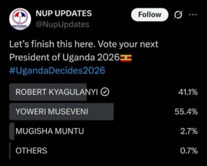 Another one conducted by NUP updates pages where close to 20,000 people voted also put Museveni in a 55.4% lead. Remember, people